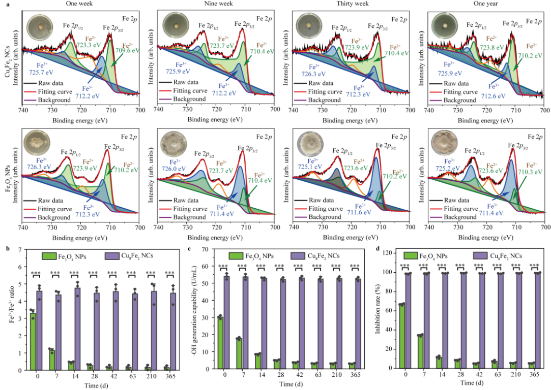 与传统Fe₃O₄纳米酶3周内完全丧失活性不同,Cu₈Fe₂ NCs在标准储存条件下可维持酶活性超过1年。其核心机制在于孪晶结构通过加速Fe³⁺向Fe²⁺的转化,抑制Fe₃O₄的氧化相变,使Fe²⁺/Fe³⁺比例长期稳定在4.5左右,确保催化活性持续稳定。这一设计成功突破了纳米酶耐久性的行业瓶颈,为长效抗菌材料的开发提供了全新思路。